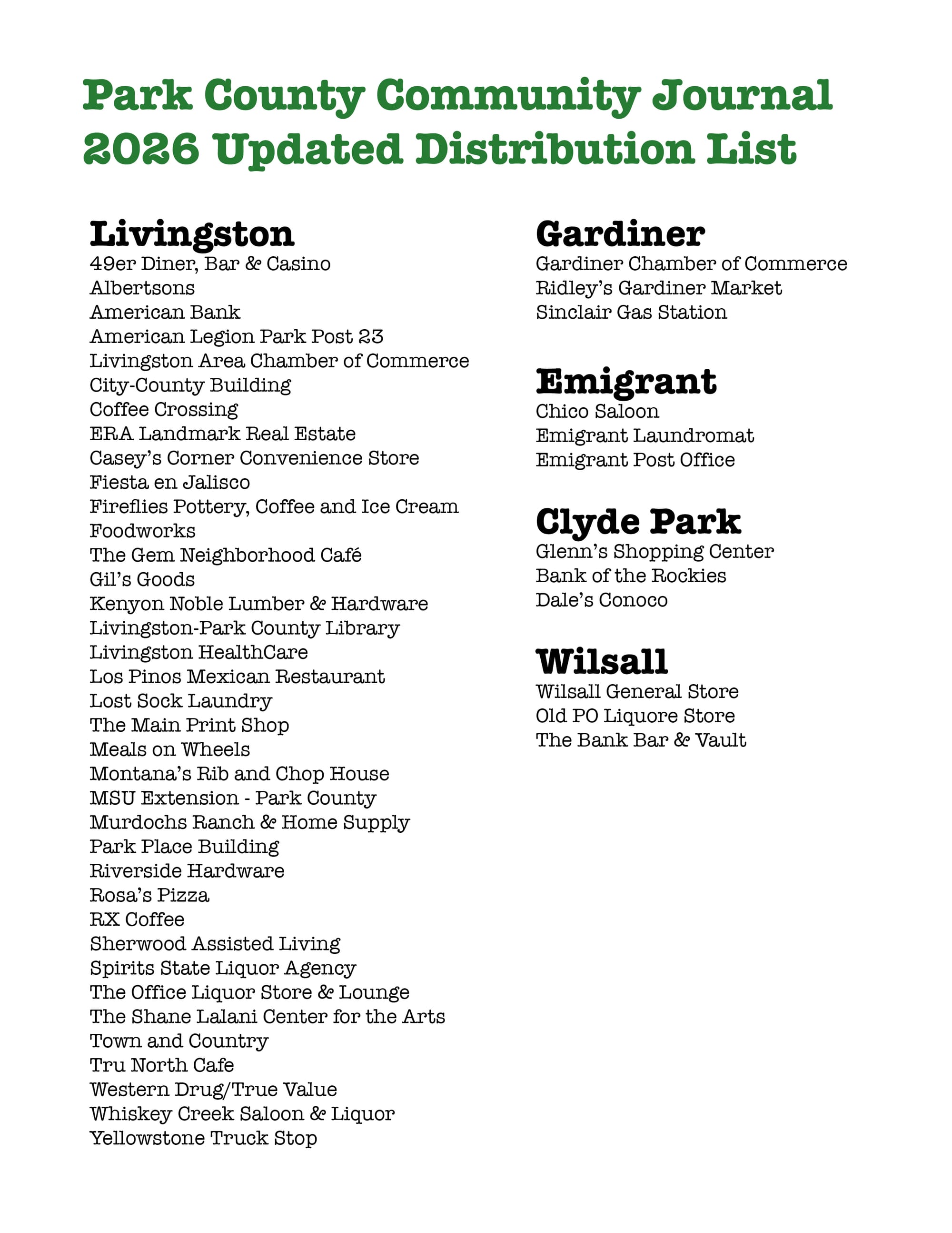 Distribution These are the locations in Park County where you can pick up the Park County Community Journal